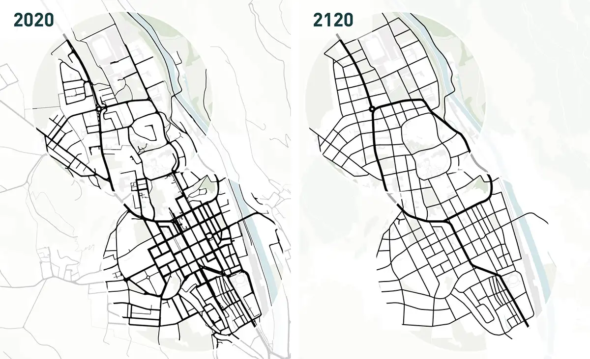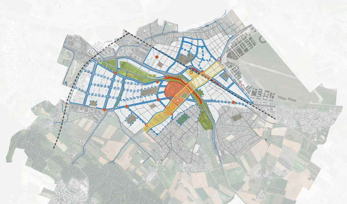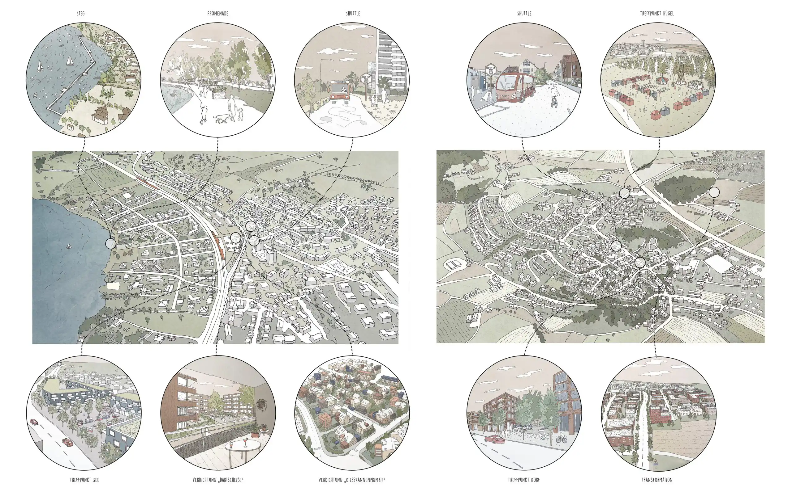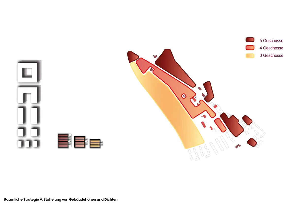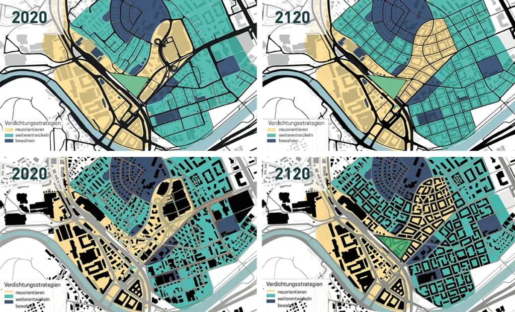 Die entwickelte Vision versteht sich nicht als starres Konzept, sondern als flexibles Modell, das vor allem die zukünftige Bevölkerungsdichte in Form von baulichen Volumina darstellt und so ein theoretisches Potenzial skizziert. Ein zentraler Bestandteil der Verdichtungsstrategie ist das übergeordnete städtebauliche Leitbild. Dieses legt nicht nur Wert auf die Optimierung des Bebauungspotenzials, sondern sichert auch ein attraktives und qualitativ hochwertiges Gesamtkonzept für den öffentlichen Raum. Dazu zählen Parks, Plätze, Straßen und Wege, die in ausreichender Quantität und hoher Qualität gestaltet und integriert werden sollen.
