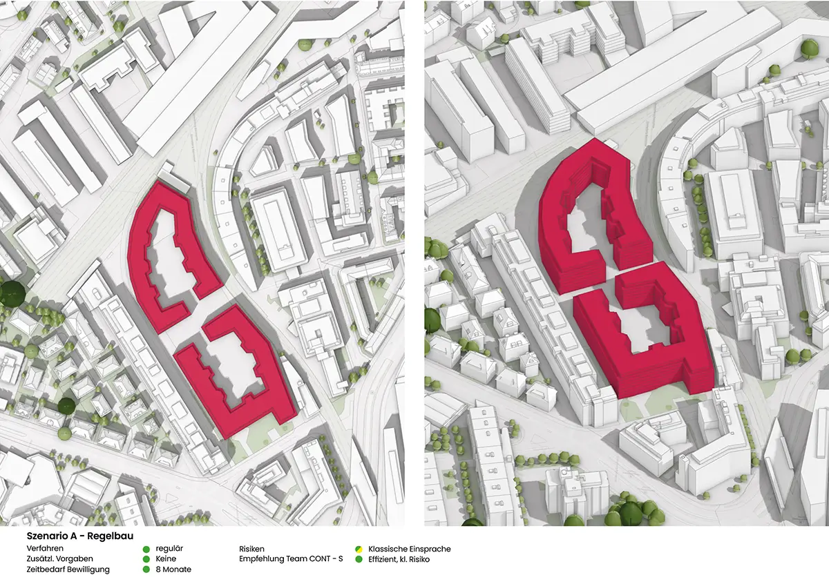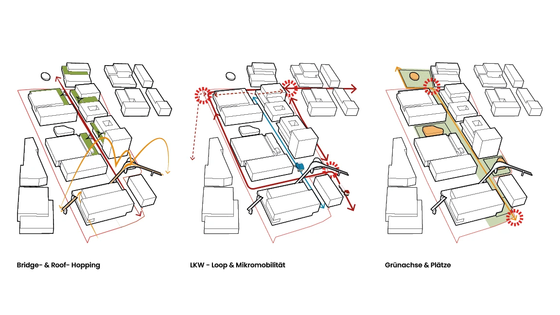 CONT–S erarbeitet hierfür eine Vision einer robusten, vielschichtigen und zugleich zeitlich wie funktional flexiblen städtebaulichen Struktur. Ziel ist es, in jeder Etappe eigenständige, identitätsstiftende Bausteine mit qualitativ hochwertigen Freiräumen zu schaffen, ohne den laufenden Gewerbebetrieb mit Anlieferung und Parkierung zu beeinträchtigen.