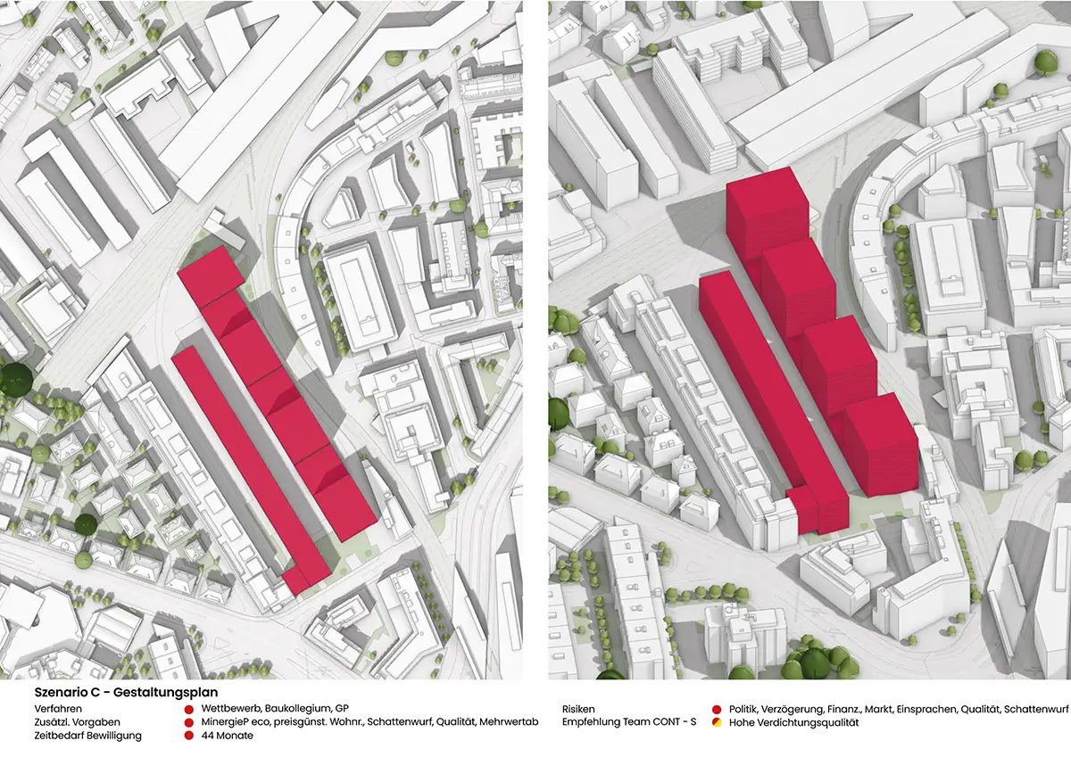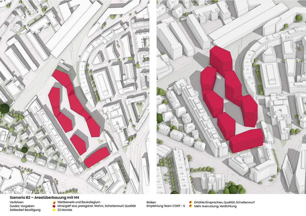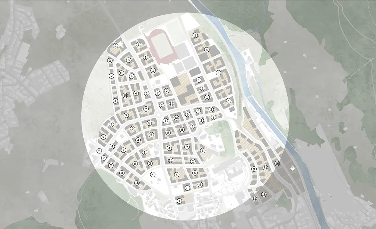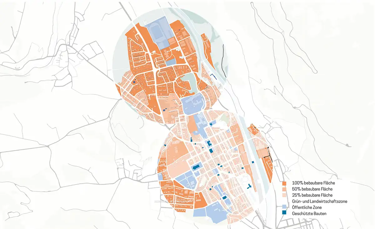 Gemäss dem Raumentwicklungskonzept (REK) wird das Quartier rund um die Oberstadt als Transformationsgebiet betrachtet. CONT-S arbeitete gemeinsam mit dem Wohnforum ETH-Case an einer innovativen, datenbasierten, dreidimensionalen Vision für eine nachhaltige und effektive Verdichtung, die sowohl ein durchdachtes Freiraum- als auch ein Mobilitätskonzept umfasst. In enger Kooperation mit der Politik, der Verwaltung, den Grundeigentümern und der Bevölkerung wurde eine vordefinierte zukünftige Personendichte festgelegt. Diese wurde anhand verschiedener städtebaulicher Szenarien analysiert und diskutiert. Im Rahmen dieses Prozesses wurden ergänzend Strategien der öffentlichen Bodenpolitik sowie Anreizsysteme für eine kooperative Entwicklung erarbeitet. Ein klimaresilientes und robustes Freiraum- sowie Erschliessungskonzept bildete das Fundament für die geplanten Verdichtungs-massnahmen. Die Vision wurde nach dem Prinzip der 10-Minuten-Stadt entwickelt, welches sicherstellt, dass sämtliche wesentlichen Dienstleistungen und Einrichtungen innerhalb von zehn Minuten fussläufig erreichbar sind. Dieses Konzept diente als Ausgangspunkt für folgende Studienaufträge in unterschiedlichen Arealen und stellt einen bedeutenden Ansatz für die zukunftsorientierte Stadtentwicklung dar.