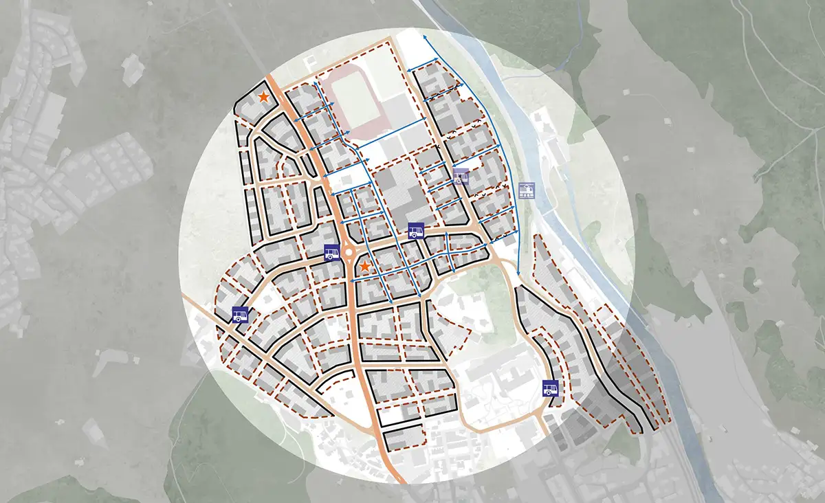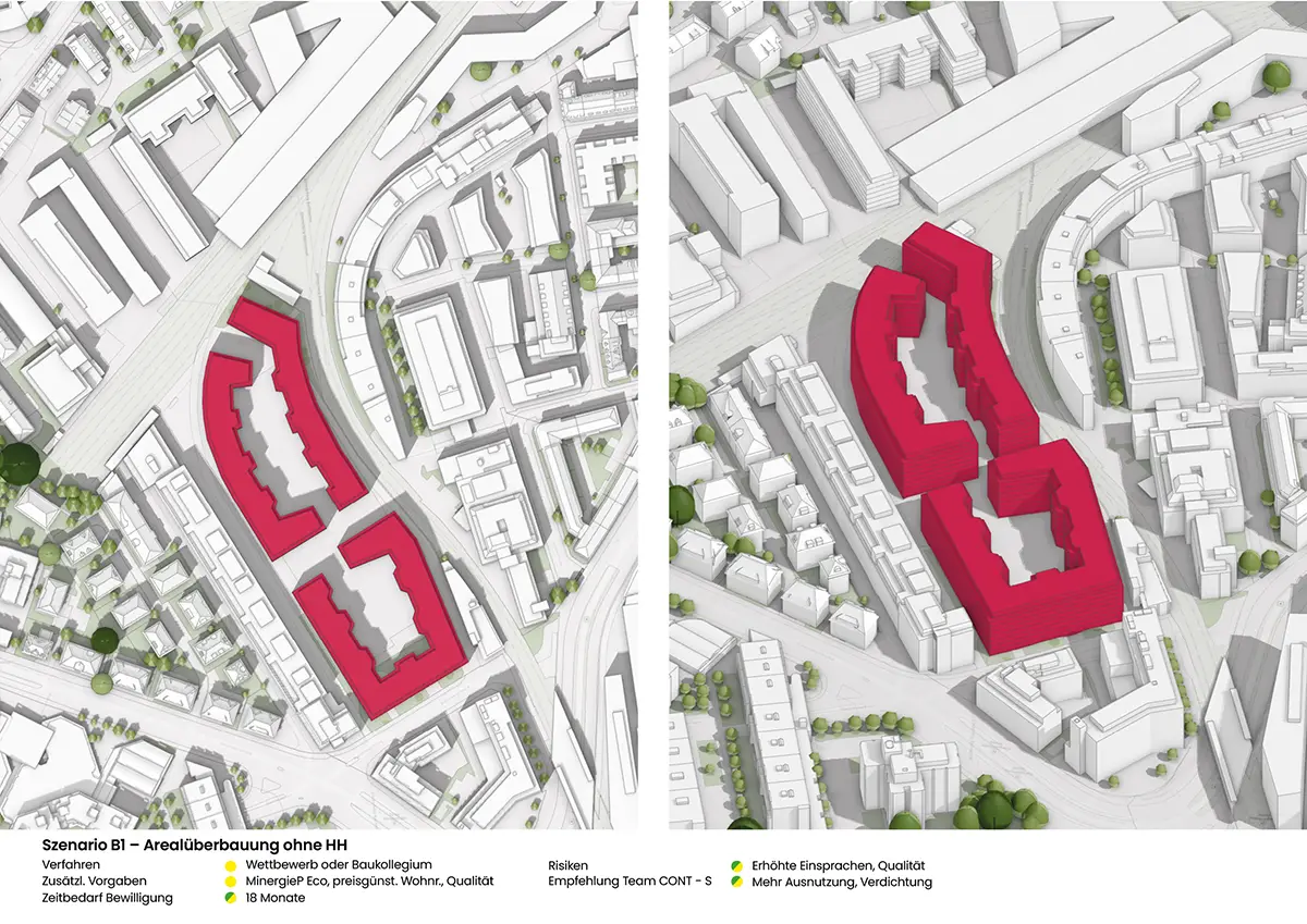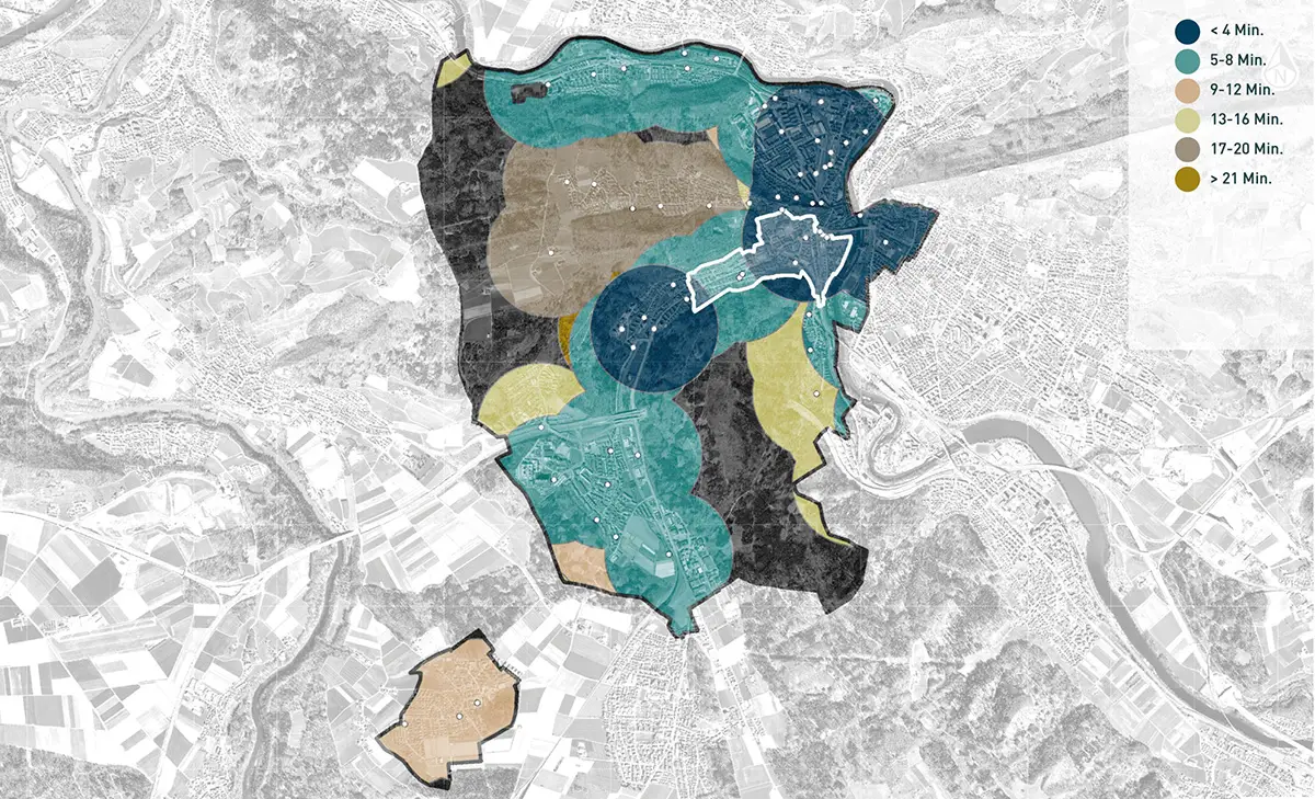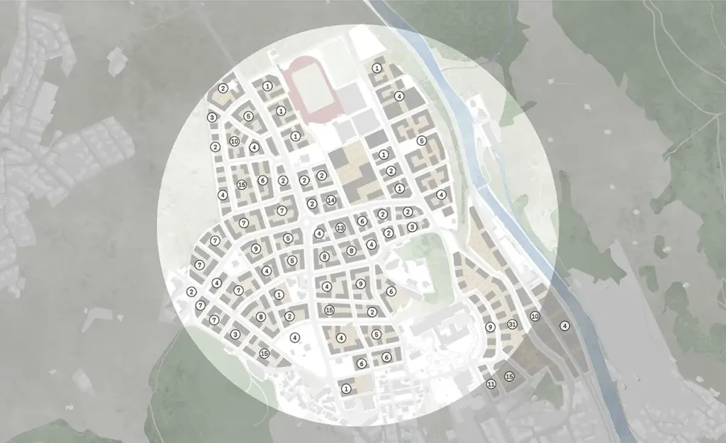 Gemäss dem Raumentwicklungskonzept (REK) wird das Quartier rund um die Oberstadt als Transformationsgebiet betrachtet. CONT-S arbeitete gemeinsam mit dem Wohnforum ETH-Case an einer innovativen, datenbasierten, dreidimensionalen Vision für eine nachhaltige und effektive Verdichtung, die sowohl ein durchdachtes Freiraum- als auch ein Mobilitätskonzept umfasst. In enger Kooperation mit der Politik, der Verwaltung, den Grundeigentümern und der Bevölkerung wurde eine vordefinierte zukünftige Personendichte festgelegt. Diese wurde anhand verschiedener städtebaulicher Szenarien analysiert und diskutiert. Im Rahmen dieses Prozesses wurden ergänzend Strategien der öffentlichen Bodenpolitik sowie Anreizsysteme für eine kooperative Entwicklung erarbeitet. Ein klimaresilientes und robustes Freiraum- sowie Erschliessungskonzept bildete das Fundament für die geplanten Verdichtungs-massnahmen. Die Vision wurde nach dem Prinzip der 10-Minuten-Stadt entwickelt, welches sicherstellt, dass sämtliche wesentlichen Dienstleistungen und Einrichtungen innerhalb von zehn Minuten fussläufig erreichbar sind. Dieses Konzept diente als Ausgangspunkt für folgende Studienaufträge in unterschiedlichen Arealen und stellt einen bedeutenden Ansatz für die zukunftsorientierte Stadtentwicklung dar.