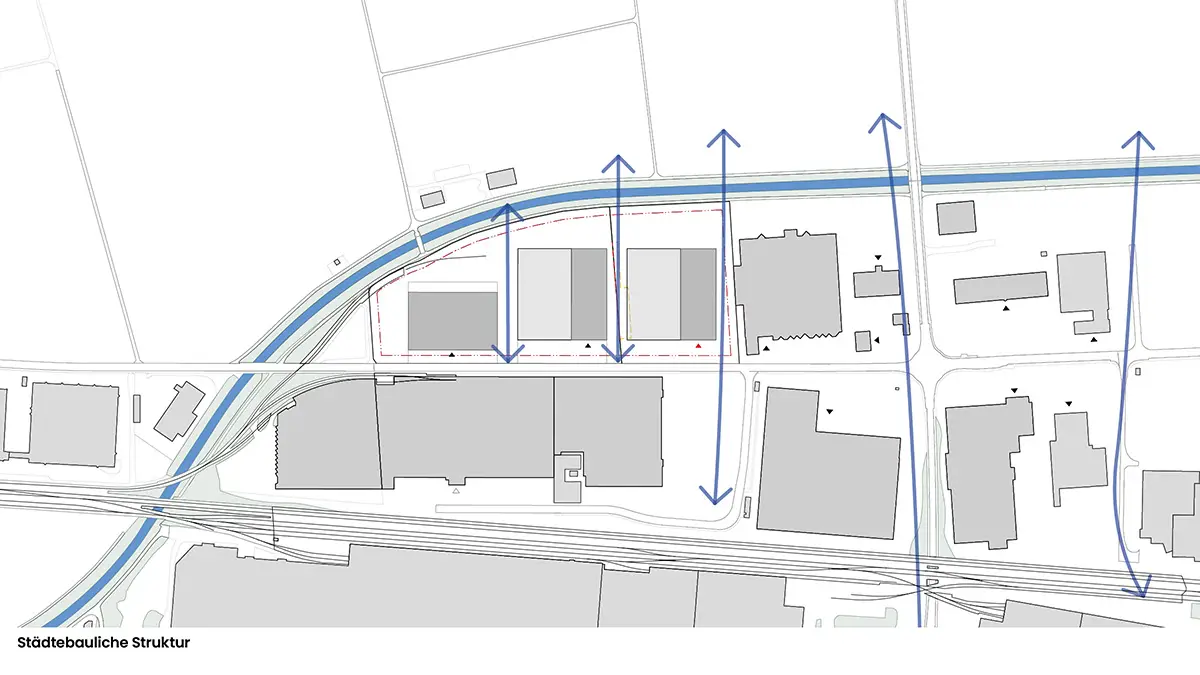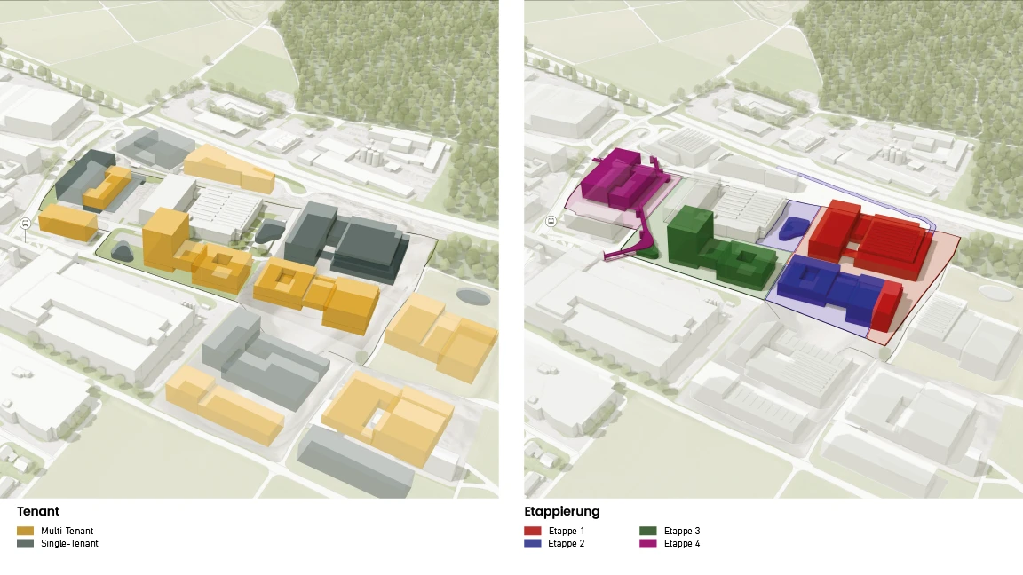 In diesem Zusammenhang spielt die Mittelachse eine zentrale Rolle. Sie gliedert das Areal in zwei unterschiedliche Gebäudetypologien. Entlang der Bahnlinien befinden sich Gebäudekomplexe mit grossen zusammenhängenden Flächen, die sich für Single-Tenants eignen. Entlang der Industriestrasse hingegen sind kleinere Strukturen für Multi-Tenants vorgesehen.