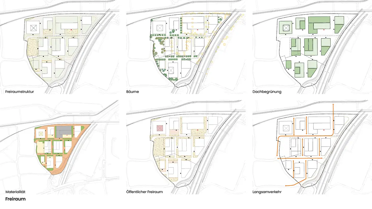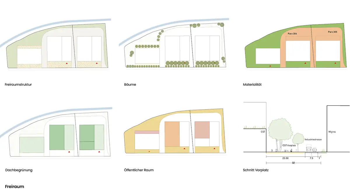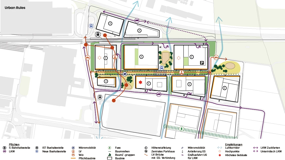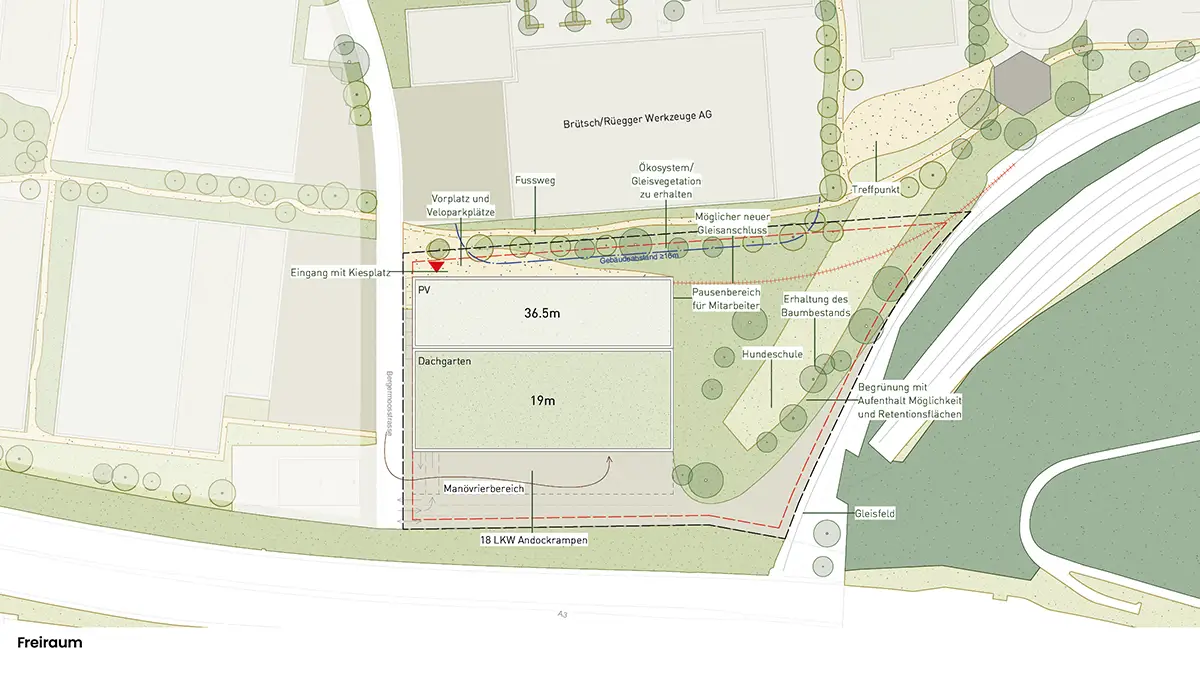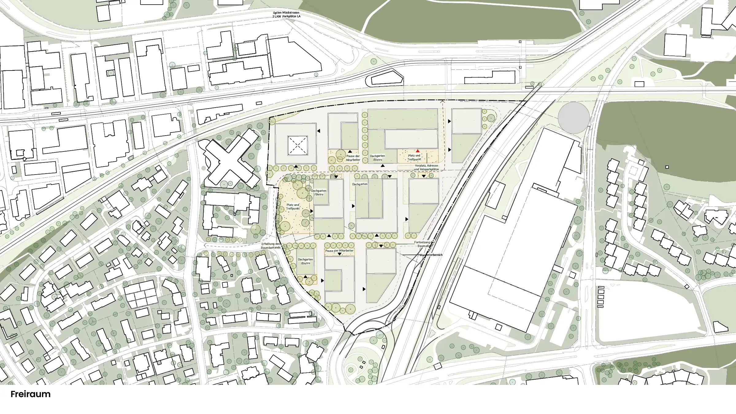 Das Konzept verfolgt einen erweiterten zeitlichen und räumlichen Bearbeitungshorizont, der Mut und Innovation erfordert, ohne jedoch die Bodenhaftung zu verlieren. Eine effiziente LKW-Erschliessung bildet den Grundpfeiler für ein produzierendes und logistikorientiertes Gewerbe. Dabei ist es wichtig, dass der Flächenverbrauch für Logistikaktivitäten nicht zulasten attraktiver Freiräume geht. Der vorgeschlagene LKW-Loop, der ausschliesslich für Lieferfahrzeuge konzipiert ist, gewährleistet, dass alle Gebäude des Areals von aussen beliefert werden können, wodurch die zentrale Mittelachse für Aufenthalts- und Erholungsflächen freigehalten wird. Das Freiraumkonzept beschreibt einen schrittweisen Übergang von einer dichten, stark bebauten Stadtstruktur im Osten zu einem durchlässigeren, grüneren Raum im Westen. Das Herz und die Identität des Areals bildet die zentrale Längsachse, die als „offener Bewegungsraum“ fungiert und vier Plätze mit unterschiedlichen gestalterischen und funktionalen Charakteren verbindet. Diese abwechslungsreiche Gestaltung fördert den erlebbaren Wechsel vom Urbanen zum Naturnahen und zielt darauf ab, einen attraktiven und nachhaltigen Begegnungsort in einem stark logistikgeprägten Gebiet zu schaffen. Der verkehrsarme Raum ist ausschliesslich für den Langsamverkehr und eine Buslinie ausgelegt und vereint Adresse, Aufenthalt und Begegnung. Die vier Orte werden bespielt mit jeweils einer speziellen Baute aus Holz. Sie steht im Gegensatz zu den industriell geprägten Bauten, vermitteln in der Massstäblichkeit und geben den Nutzern ein Gefühl von Ruhe und Rückzug. Das städtebauliche Konzept basiert auf einem durchdachten Freiraum- und Erschliessungsgerüst und integriert die Volumen entsprechend den lokalen Gegebenheiten, ohne die Zusammengehörigkeit zu beeinträchtigen und somit die Identität des gesamten Areals zu schwächen.