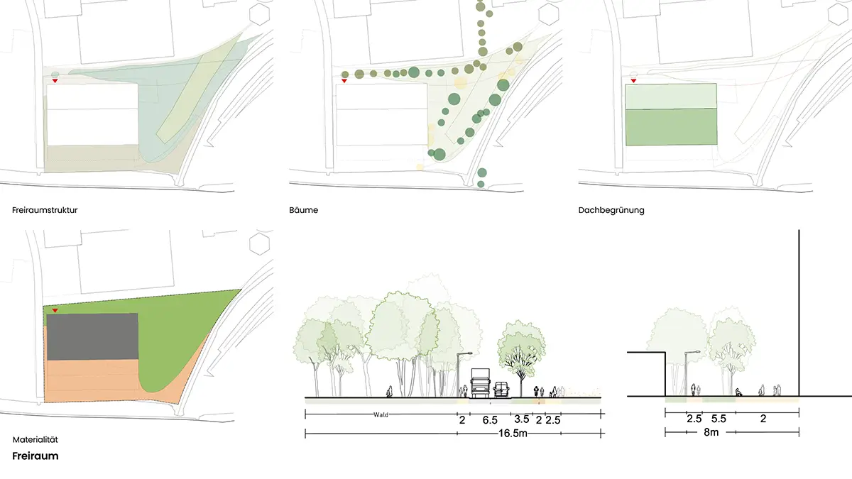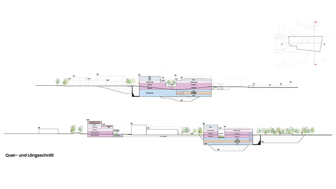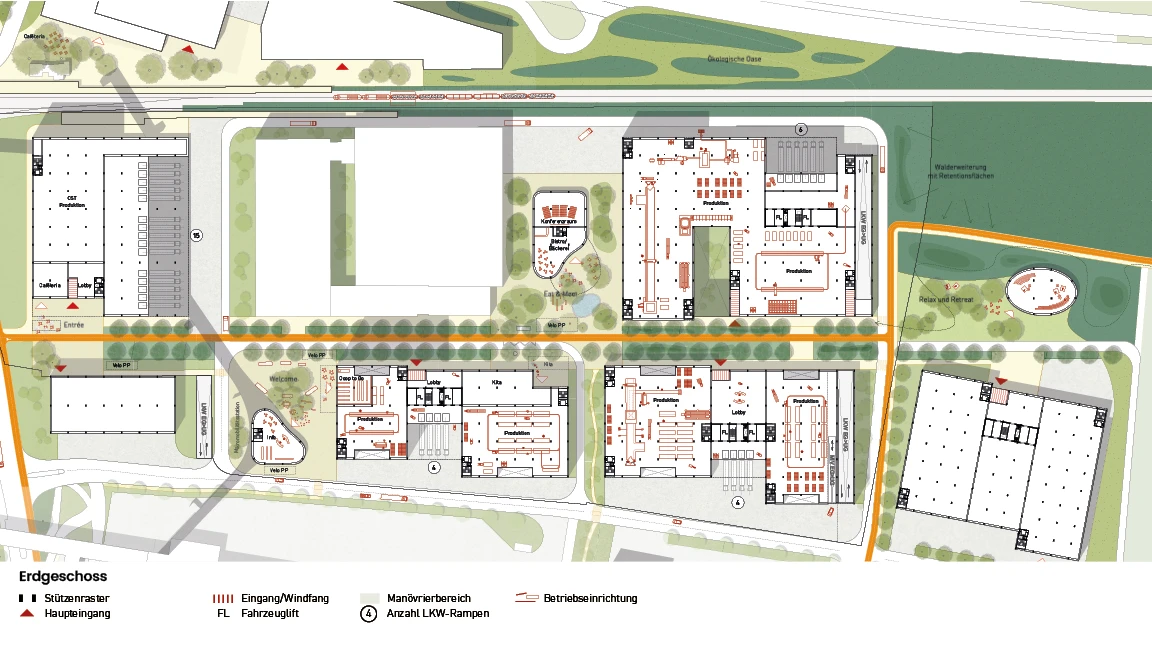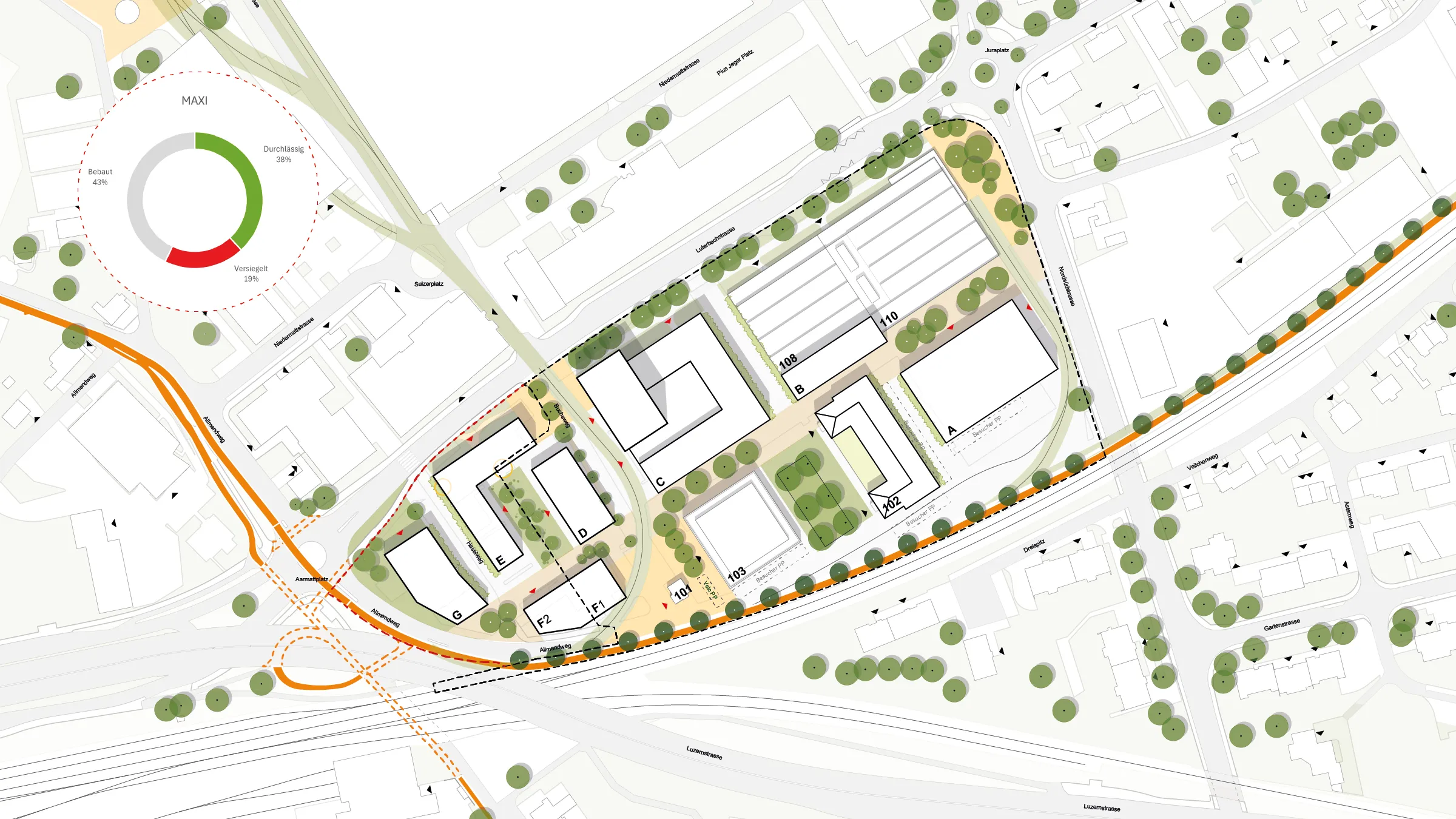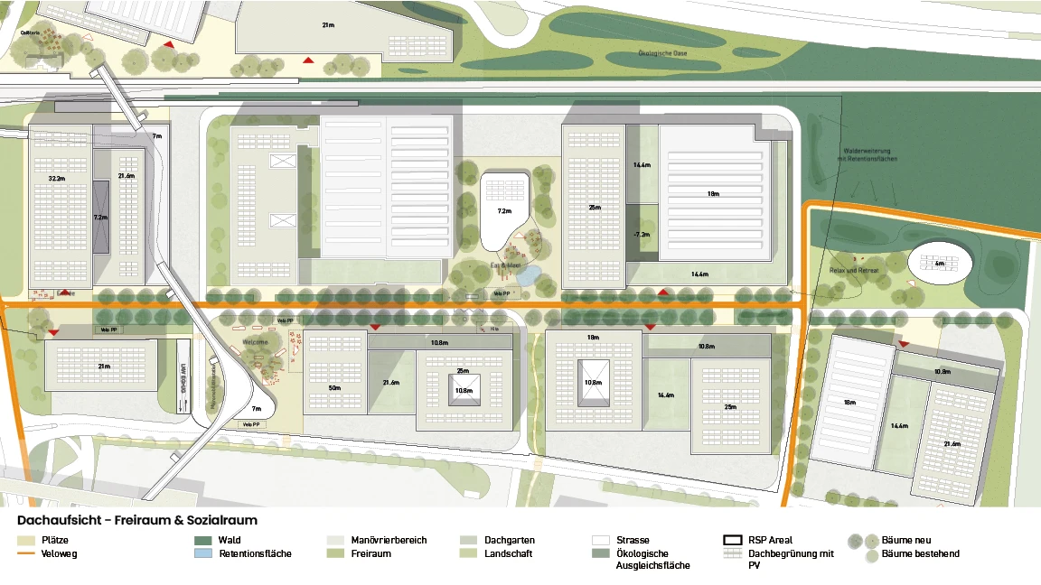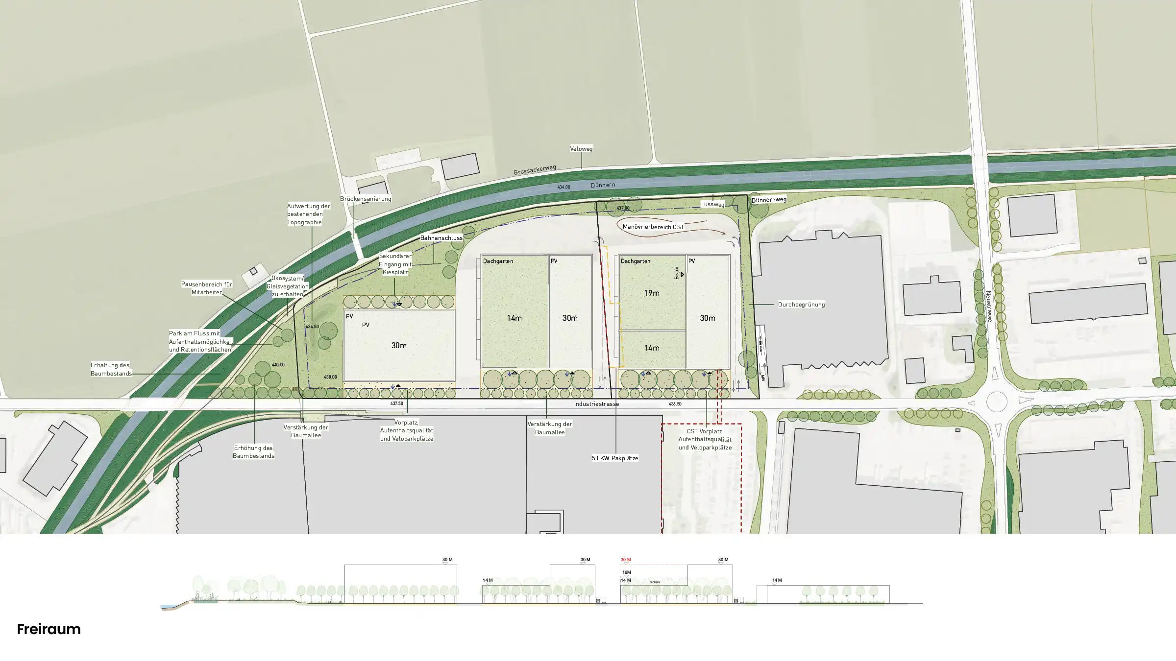 Das Konzept verfolgt einen erweiterten zeitlichen und räumlichen Bearbeitungshorizont, der Mut und Innovation erfordert, ohne jedoch die Bodenhaftung zu verlieren. Eine effiziente LKW-Erschliessung bildet den Grundpfeiler für ein produzierendes und logistikorientiertes Gewerbe. Dabei ist es wichtig, dass der Flächenverbrauch für Logistikaktivitäten nicht zulasten attraktiver Freiräume geht. Der vorgeschlagene LKW-Loop, der ausschliesslich für Lieferfahrzeuge konzipiert ist, gewährleistet, dass alle Gebäude des Areals von aussen beliefert werden können, wodurch die zentrale Mittelachse für Aufenthalts- und Erholungsflächen freigehalten wird. Das Freiraumkonzept beschreibt einen schrittweisen Übergang von einer dichten, stark bebauten Stadtstruktur im Osten zu einem durchlässigeren, grüneren Raum im Westen. Das Herz und die Identität des Areals bildet die zentrale Längsachse, die als „offener Bewegungsraum“ fungiert und vier Plätze mit unterschiedlichen gestalterischen und funktionalen Charakteren verbindet. Diese abwechslungsreiche Gestaltung fördert den erlebbaren Wechsel vom Urbanen zum Naturnahen und zielt darauf ab, einen attraktiven und nachhaltigen Begegnungsort in einem stark logistikgeprägten Gebiet zu schaffen. Der verkehrsarme Raum ist ausschliesslich für den Langsamverkehr und eine Buslinie ausgelegt und vereint Adresse, Aufenthalt und Begegnung. Die vier Orte werden bespielt mit jeweils einer speziellen Baute aus Holz. Sie steht im Gegensatz zu den industriell geprägten Bauten, vermitteln in der Massstäblichkeit und geben den Nutzern ein Gefühl von Ruhe und Rückzug. Das städtebauliche Konzept basiert auf einem durchdachten Freiraum- und Erschliessungsgerüst und integriert die Volumen entsprechend den lokalen Gegebenheiten, ohne die Zusammengehörigkeit zu beeinträchtigen und somit die Identität des gesamten Areals zu schwächen.