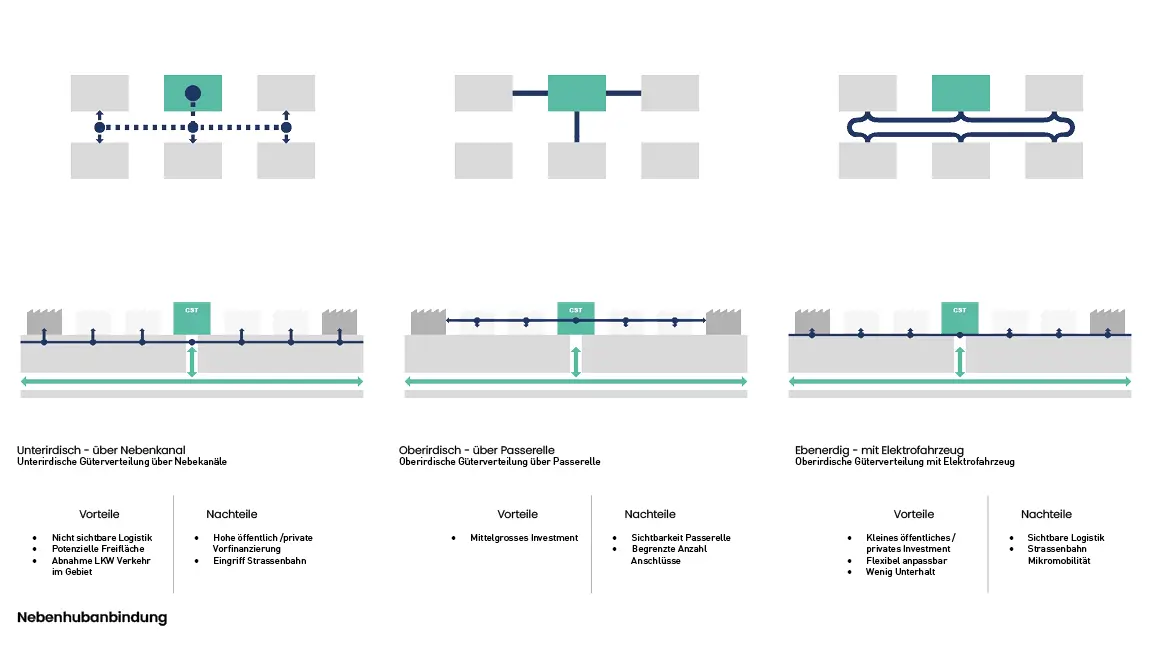 Auf einer tieferen Ebene wurde ein Hub-Modul entwickelt, das den flächenintensiven CST-Betrieb sichert und gleichzeitig einen neuen Gewerbebau-Typ für arbeitsplatzintensive Flächen für Produktion 4.0 und lichtdurchflutete Dienstleistungen etabliert. Für alle Hubs wurden entsprechende Leitsätze zum Fussabdruck, Verdichtung in die Höhe, ökologischer und hitzemindernder Freiraum, Langsamverkehrsnetz formuliert.