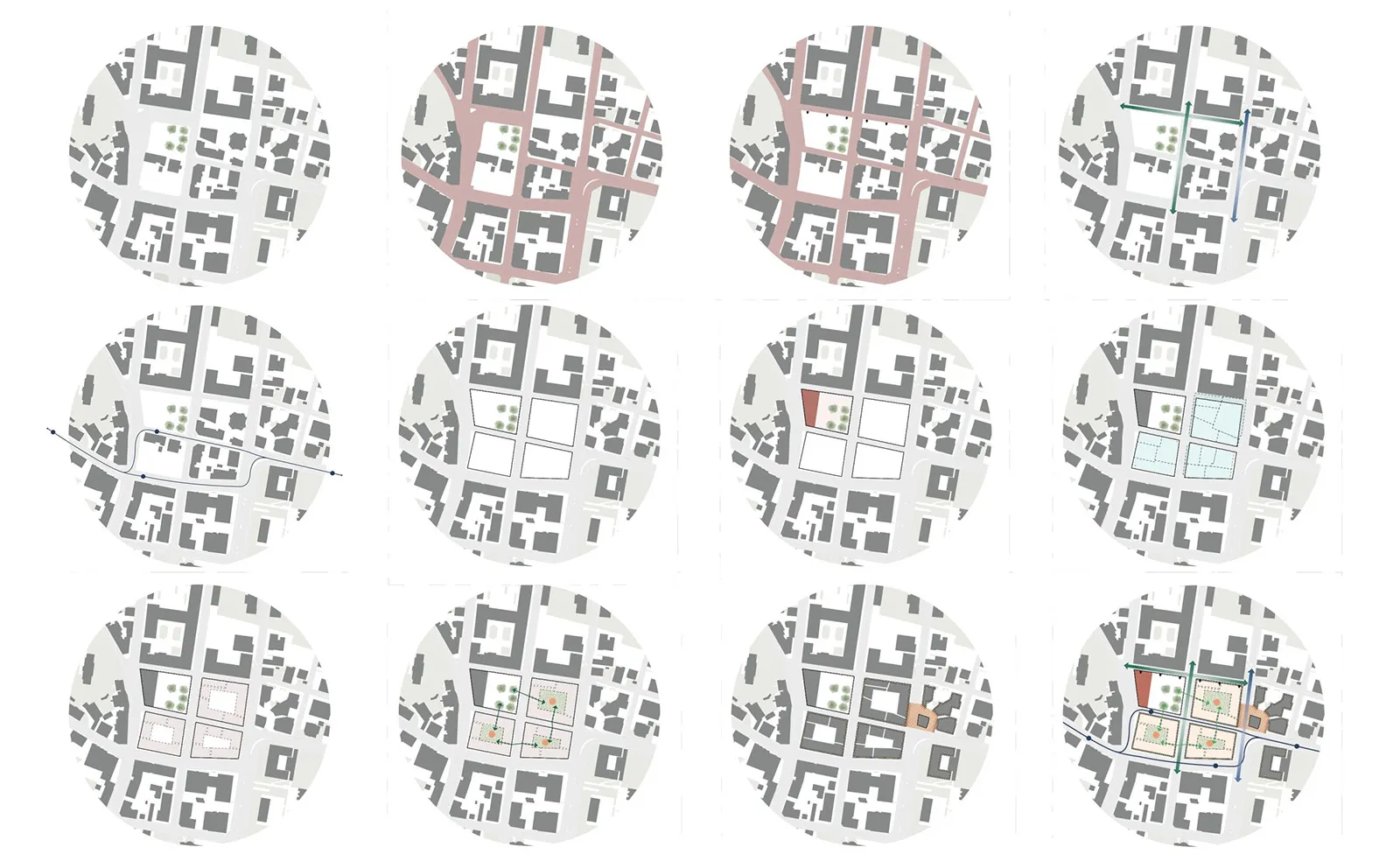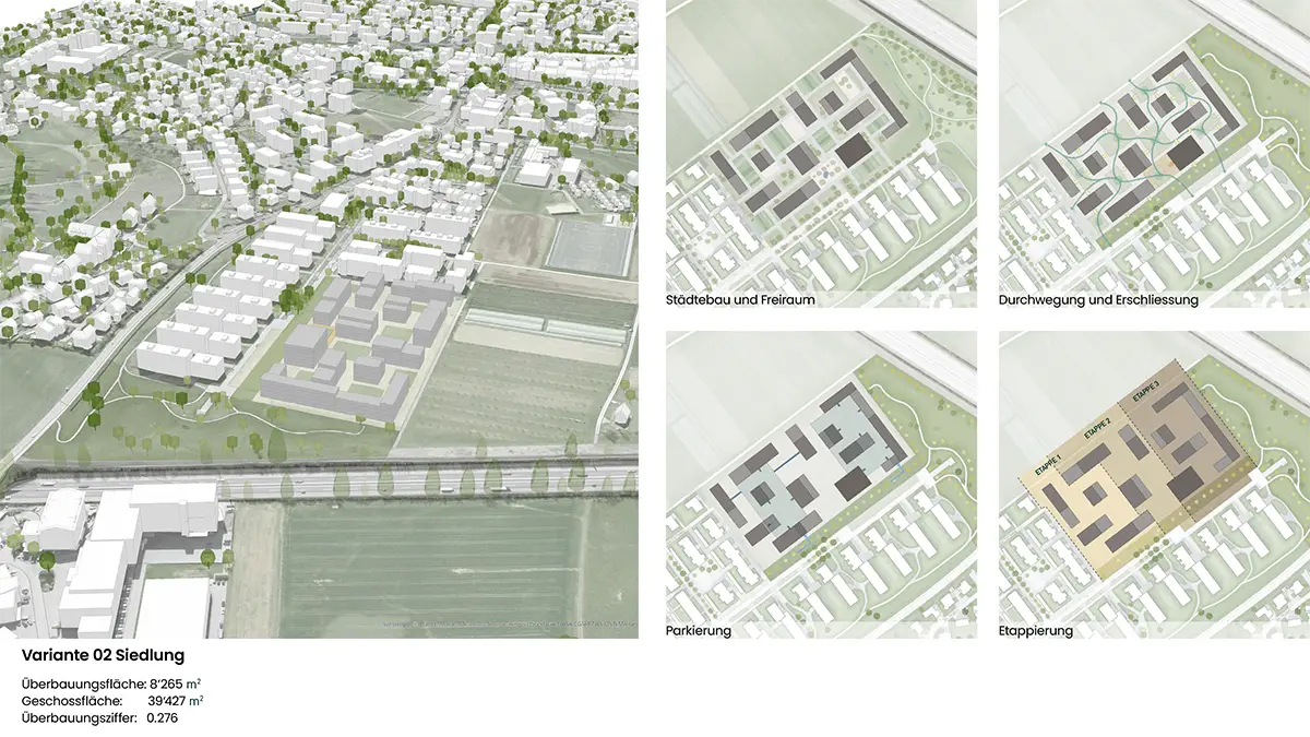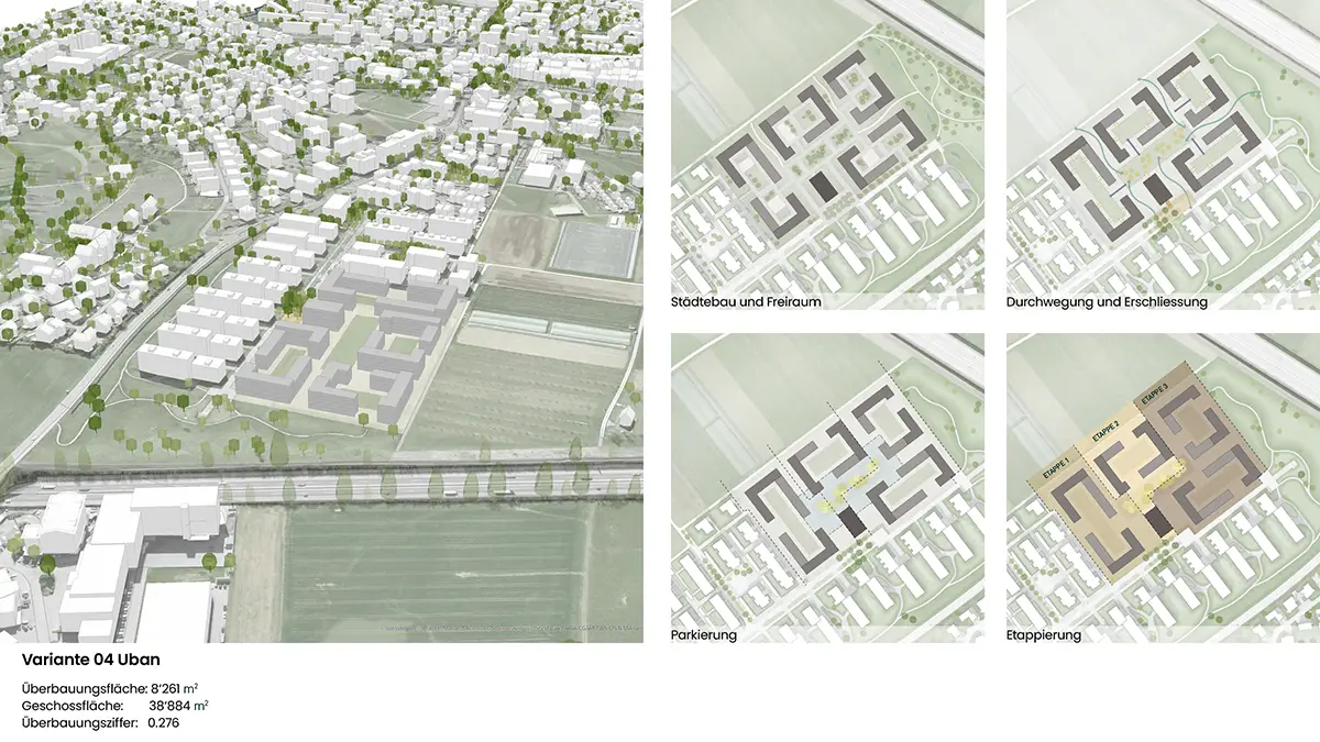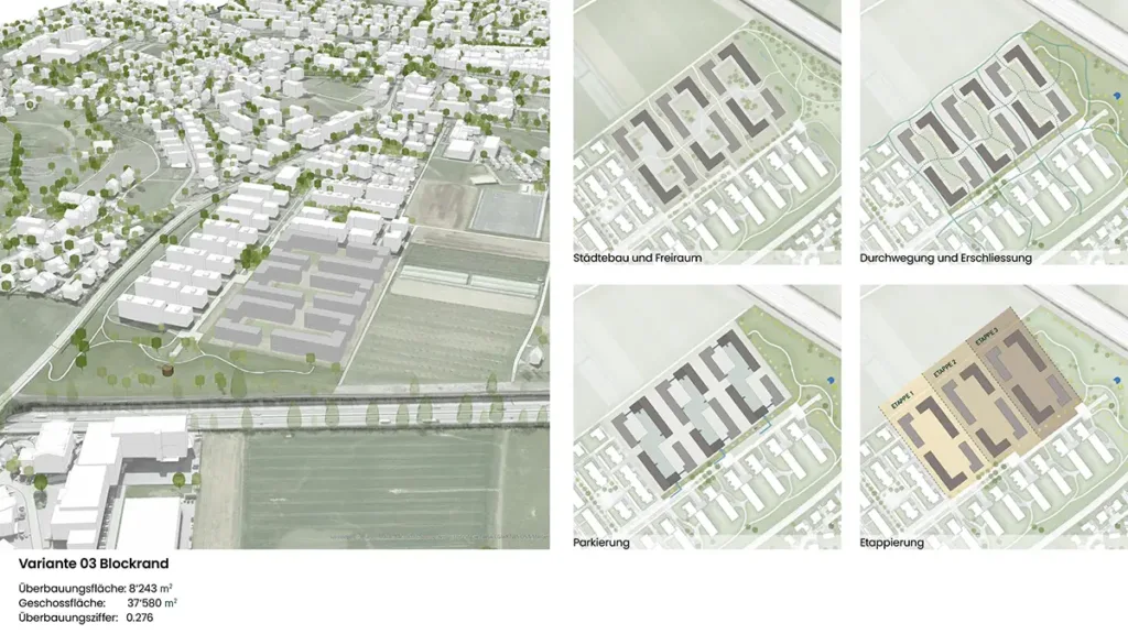 Das Projekt von CONT-S überzeugte durch die innovative Idee eines öffentlichen Gebäudes auf der Piazza, das als Aktivator fungieren soll. Die Nutzung dieses Gebäudes soll durch die Bevölkerung mitbestimmt werden, was die Akzeptanz und Identifikation der Anwohner fördern soll. Darüber hinaus wurden die „Urban Rules“ erarbeitet, die sicherstellen, dass Qualität und Unabhängigkeit in der Entwicklung gewährleistet sind. Ein zentraler Aspekt für die Sicherstellung einer unabhängigen und nachhaltigen Entwicklung innerhalb der Baubereiche ist der Vorschlag, alle privaten Parkplätze in einer zentralen Tiefgarage auf der öffentlichen Parzelle zu konzentrieren. Dies ermöglicht eine bessere Flächennutzung und reduziert zusätzlich die Versiegelung. Die städtebauliche Konzeption orientiert sich stark an der Geschichte des Quartiers und dem grossräumigen Kontext. Die klassische Blockrandstruktur mit gemeinschaftlichen, begrünten Innenhöfen bildet das Grundgerüst des Entwurfs, dessen Einbettung durch ein neues informelles Wegnetz verstärkt wird. Die neu platzierte Bushaltestelle am öffentlichen Platz und die gezielte Reduktion befahrbarer Strassen erhöhen die Aufenthaltsqualität und Sicherheit für Fussgänger und Radfahrer. All diese Massnahmen tragen dazu bei, ein lebendiges, gut vernetztes urbanes Umfeld zu schaffen, das sowohl traditionell verwurzelt ist als auch den modernen Bedürfnissen der Bewohner gerecht wird.