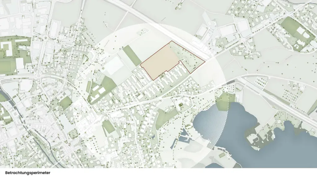Die Brun AG besitzt ein grosses Areal auf der nördlichen Gleisseite, direkt gegenüber dem Bahnhof Emmenbrücke. Auf Grundlage des von der Gemeinde entwickelten städtebaulichen Leitbildes erarbeitete CONT-S eine konkrete städtebauliche Vision im Sinne einer 10-Minuten-Stadt. Der Betrachtungsperimeter für die datenbasierte und konzeptionelle Entwicklung dieser Vision umfasste einen Umkreis von etwa 500 Metern, also rund 80 Hektaren. Ein daraus abgeleitetes Freiraum- und Erschliessungskonzept definierte die Baubereiche, die mit einer hohen Bebauungs- und Personendichte hinterlegt wurden. Um die angestrebte Qualität und adäquate Quantität des öffentlichen Raums sicherzustellen—insbesondere um die einzige Fussverbindung vom Bahnhof zu den nördlich gelegenen Quartieren zu gewährleisten—wurden Urban Rules formuliert. Diese bildeten die Grundlage für die anschliessend lancierten Wettbewerbsverfahren.