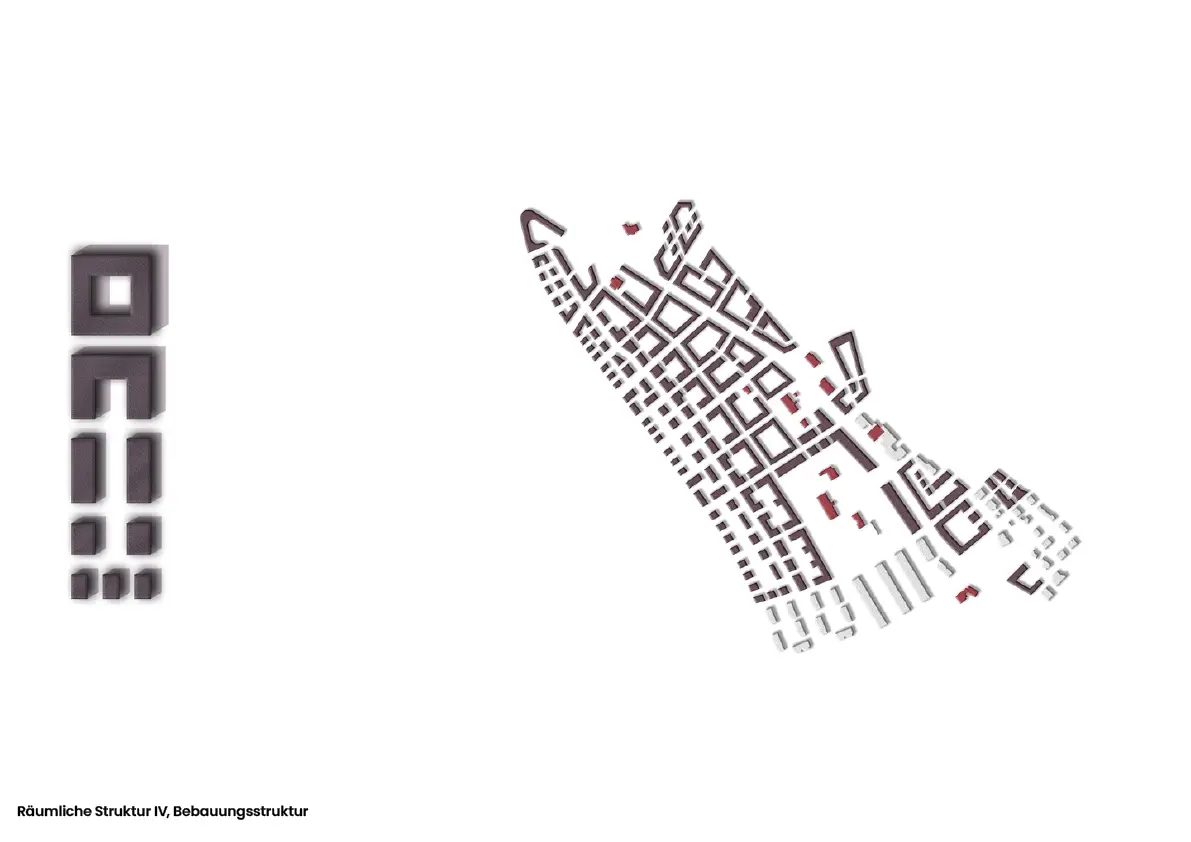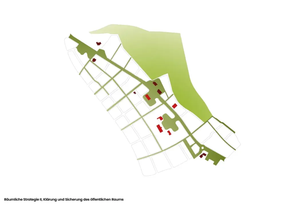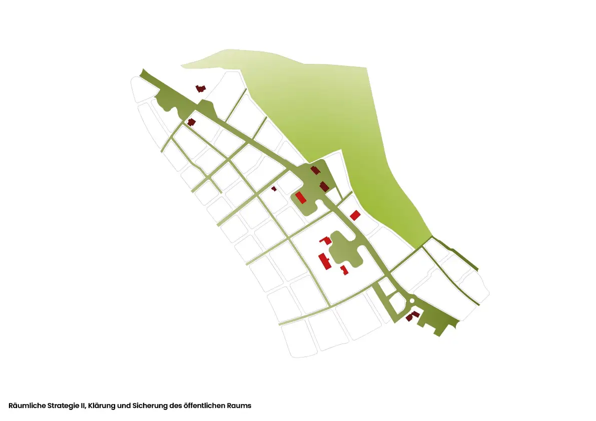 Die in der räumlichen Strategie vorgesehenen Baustrukturen orientieren sich am bestehenden Straßennetz, das erhalten, ergänzt und weitergeführt werden kann. Die neuen Baufelder, die etwa vier verschiedenen Eigentümern zugeordnet werden, sollen durch geeignete Anreize eine übersichtliche und effiziente Entwicklungsdynamik ermöglichen.