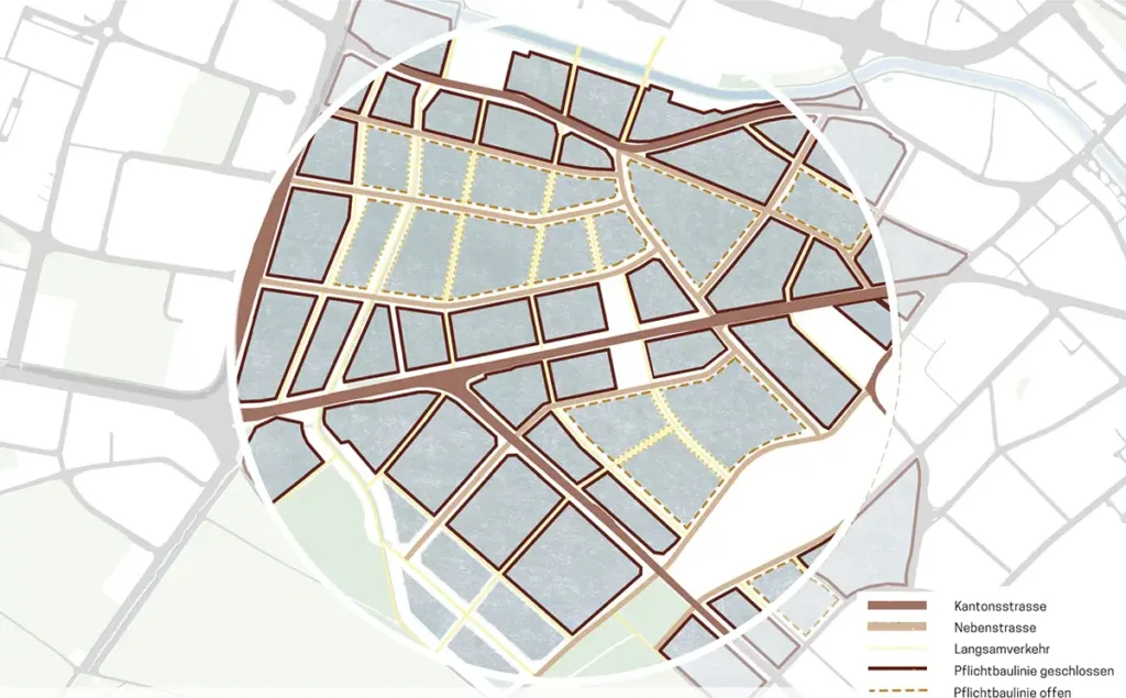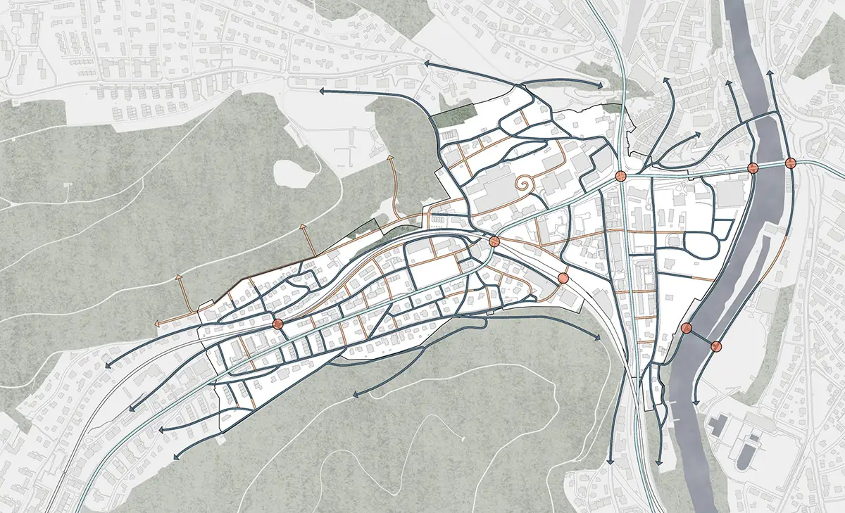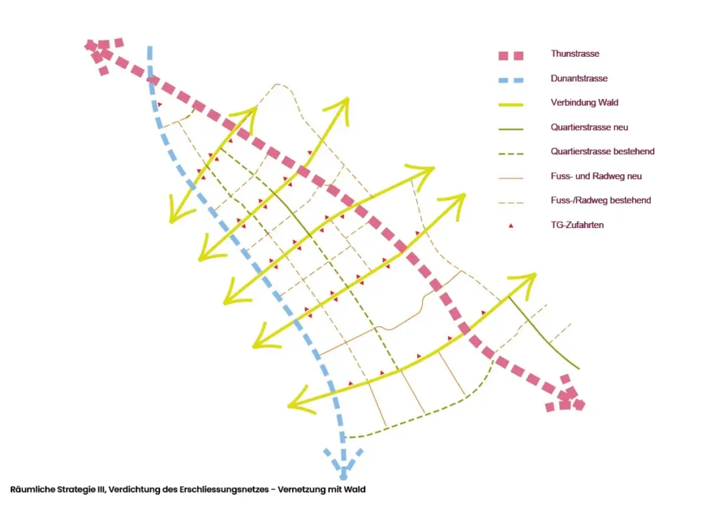 Die Leitlinien fördern eine zukunftsorientierte Entwicklung der logistisch geprägten Gewerbegebiete. Ein robustes Freiraum- und Erschliessungskonzept soll nicht nur einen reibungslosen Logistikverkehr gewährleisten, sondern auch attraktive Aufenthaltsorte für Besucher und Mitarbeitende schaffen. Zudem wird eine bessere Zugänglichkeit für Fussgänger und Radfahrer angestrebt, um den motorisierten Individualverkehr zu reduzieren. Dabei bildet eine „Ringstrasse“ das Hauptelement, um den internen Verkehr zu steuern und die Sicherheit des Langsamverkehrs (Fussgänger- und Fahrradwege) zu verbessern.
