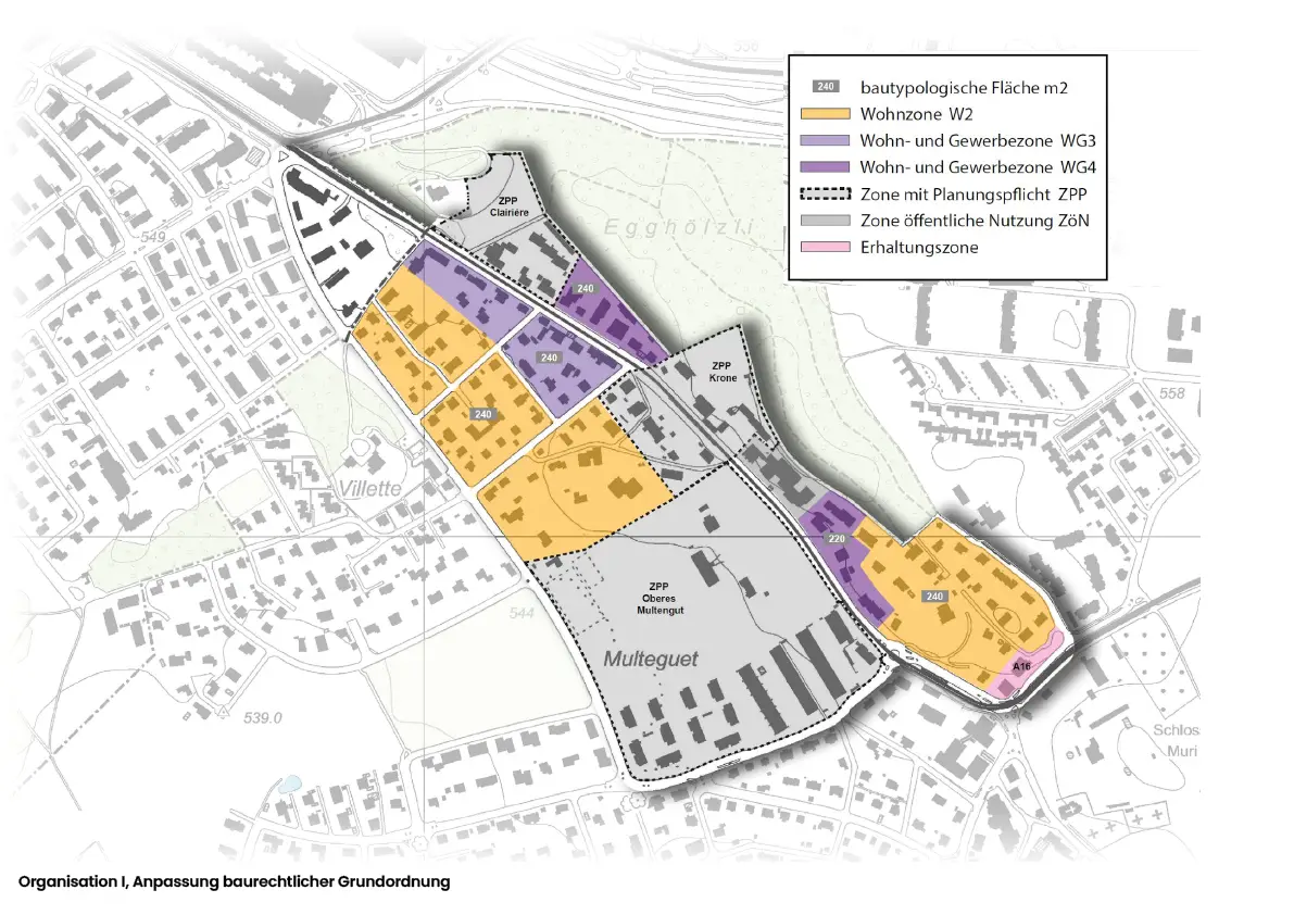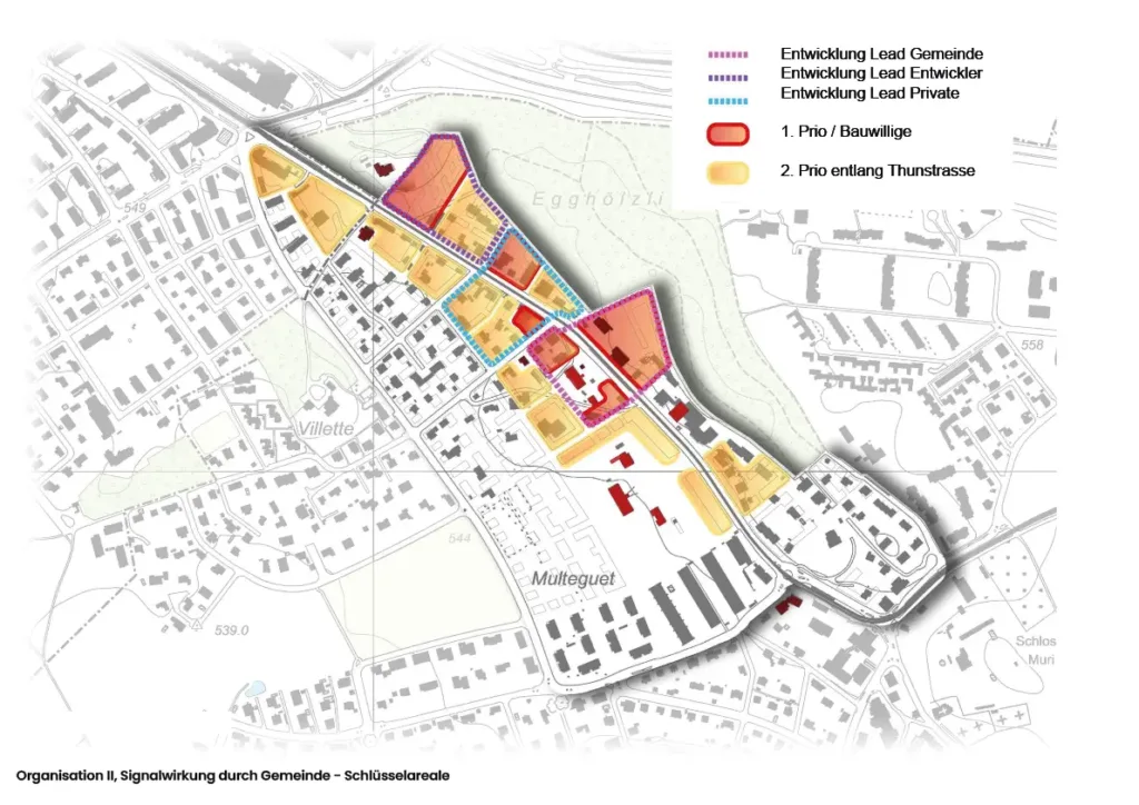 Die Gemeinde Muri bei Bern erkennt im Gebiet «5-Egg/Thunstrasse» im Kontext des Bevölkerungswachstums ein erhebliches nutzungsbezogenes und baulich-räumliches Entwicklungspotenzial. Die aktuelle Situation wird sowohl aus funktionaler als auch aus städtebaulicher Sicht als unbefriedigend eingeschätzt. Gleichzeitig schränkt die bestehende planungsrechtliche Ausgangslage mit ihrem begrenzten Entwicklungsspielraum sowohl die Art als auch das Maß der zulässigen Nutzungen ein.