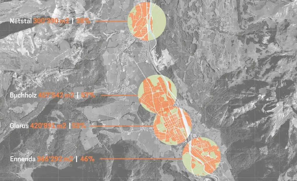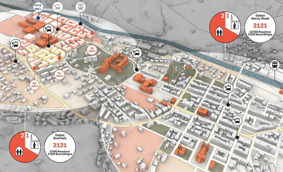 Die Interessensgemeinschaft Buchholz, ein Zusammenschluss zahlreicher Eigentümer des umgezonten Gebiets, beauftragte zusammen mit der Gemeinde Glarus CONT-S mit der Erarbeitung einer nachhaltigen Entwicklungsstrategie gemäss der Methodik UrbanVision. In diesem Prozess wurden verschiedene Faktoren analysiert und bewertet, darunter die vorhandenen sowie potenziell bebaubaren Flächen, die Vernetzung der Quartiere, ihre räumlichen und baulichen Qualitäten sowie deren Entwicklungs-potenzial. Auf dieser Grundlage wurde eine freiräumliche, erschliessungsstechnische und städtebauliche Vision entwickelt, die gezielt Orte der Verdichtung, der Erhaltung und der Aufwertung definiert. Ziel ist es, ein qualitativ hochwertiges Wachstum zu ermöglichen, das den Bedürfnissen der künftigen Bewohner und Nutzer gerecht wird. Zur Förderung der Entwicklung wurden Anreizsysteme sowie eine proaktive Strategie für die Bodenpolitik geschaffen, um eine nachhaltige Nutzung der Ressourcen sicherzustellen.