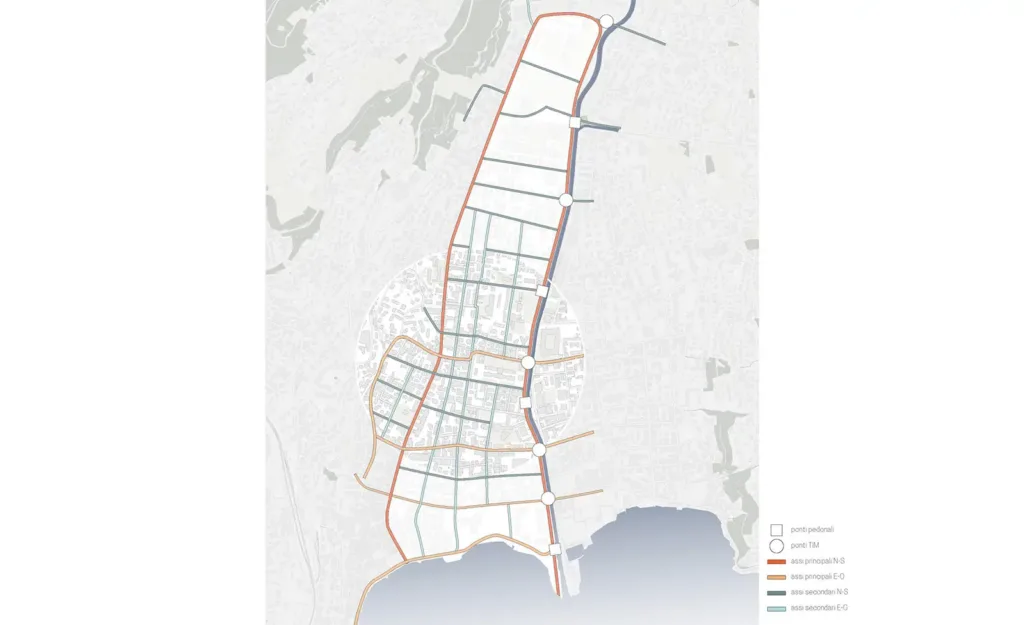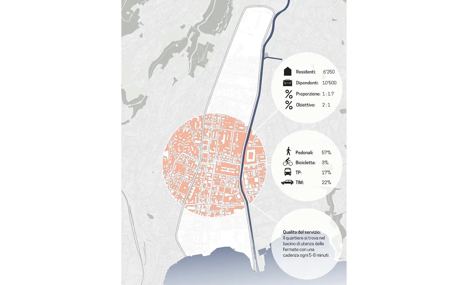 Zwei neu strukturierte Achsen für den Langsamverkehr verbinden effizient Ost mit West, Nord mit Süd und Natur mit Kultur. Im Schnittpunkt dieser Achsen liegt das derzeit stark unterentwickelte Quartier Morettina. Durch die Neustrukturierung dieses Quartiers wird eine hohe Verdichtung angestrebt, die in ein neues Freiraum- und Erschliessungsnetz eingebettet ist, um das Konzept einer „10-Minuten-Stadt“ erfolgreich umzusetzen. Die sorgfältige Integration des bestehenden Schulcampus sowie die gezielte Ansiedlung audiovisueller Einrichtungen wie CineHub und CineCittà stärken das Quartier und die Stadt als nationalen und internationalen Mittelpunkt für Bildung, Innovation und Produktion im Filmsektor.