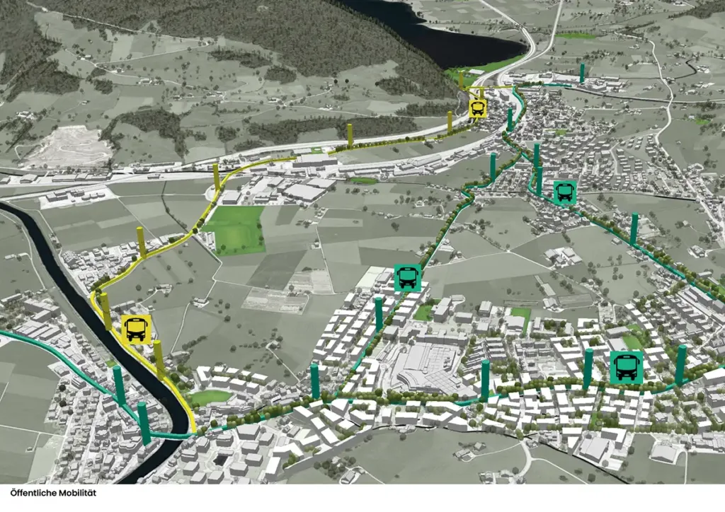 Das bestehende Raumentwicklungskonzept für Dübendorf wurde von CONT-S im interdisziplinären Team als umfassende Vision weiterentwickelt. Eines der zentralen Elemente dieser Vision ist der „Fil Jaune“ (das gelbe Wappen Dübendorfs), der als Ergänzung zu den bestehenden „Fil Bleu“ (Glattraum), „Fil Vert“ (Grünraum) und „Fil Rouge“ (Veloroute) verstanden wird. Dieser langgestreckte, stark begrünte öffentliche Raum erstreckt sich vom Südwesten bis zum Bahnhof und wird massgeblich von öffentlichen Bauten und Nutzungen wie Schulhäusern und dem Stadthaus strukturiert. Der Grünstreifen fungiert gleichzeitig als Orientierungspunkt, Identifikationsmerkmal, Zentrum sowie als Luftkorridor, wodurch er eine zentrale Rolle im städtebaulichen Netzwerk Dübendorfs einnimmt. Auf Basis dieses Freiraumkonzepts wurden durch aufwändige, datenbasierte räumliche Analysen sowohl eine Verdichtungsstrategie als auch ein Anreizsystem entwickelt. Um die angestrebte Qualität der öffentlichen Räume zu gewährleisten, wurden sogenannte „Urban Rules“ formuliert, die als Teil der Revision der Bau- und Nutzungsverordnung (BNO) integriert werden. Zur Förderung der Akzeptanz und aktiven Mitgestaltung der Bürger wurde eine umfassende Online-Partizipation eingerichtet, die es der Bevölkerung, ihre Ansichten, Vorschläge und Bedenken einzubringen, wodurch ein stärkeres Gemeinschaftsgefühl und eine höhere Identifikation mit den Plänen erreicht wurden.